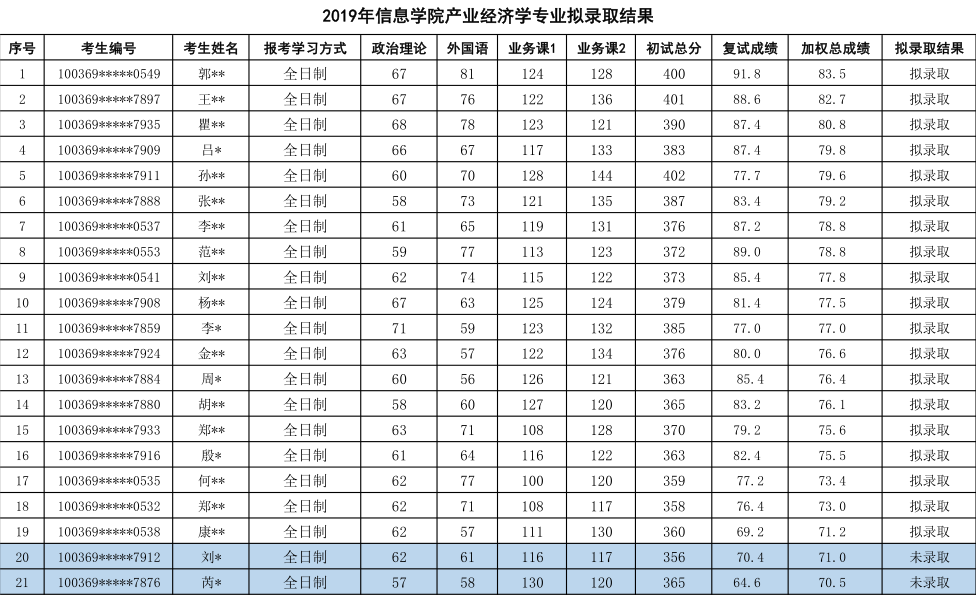 2019年对外经济贸易大学产业经济学(信息学院)专业硕士研究生拟录取名单