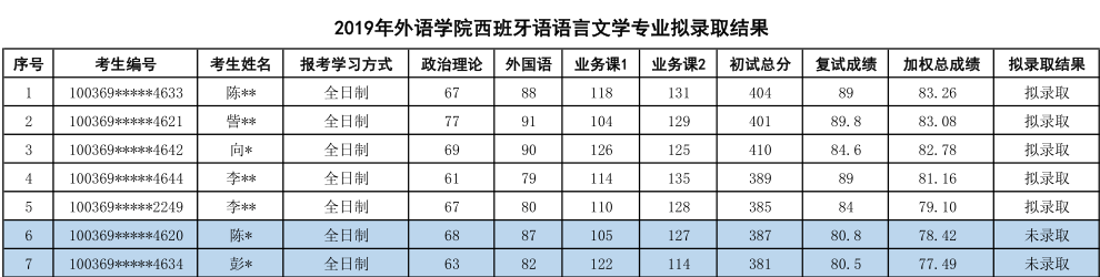 2019年对外经济贸易大学西班牙语语言文学专业硕士研究生拟录取名单