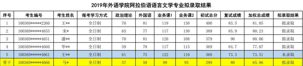2019年对外经济贸易大学阿拉伯语语言文学专业硕士研究生拟录取名单