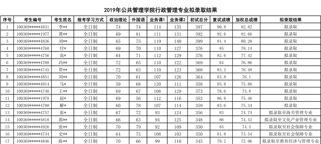 2019年对外经济贸易大学行政管理专业硕士研究生拟录取名单