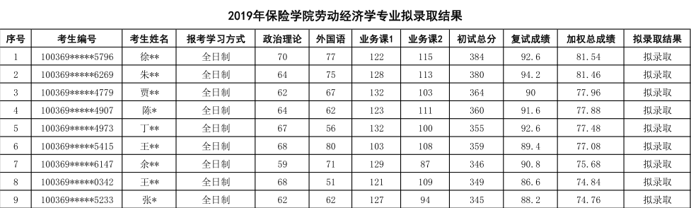 2019年对外经济贸易大学劳动经济学专业硕士研究生拟录取名单
