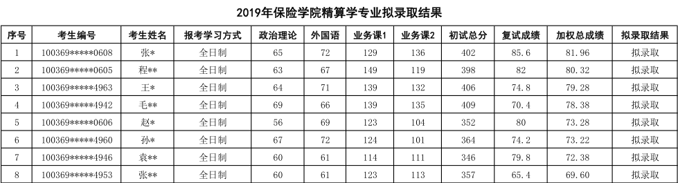 2019年对外经济贸易大学精算学专业硕士研究生拟录取名单