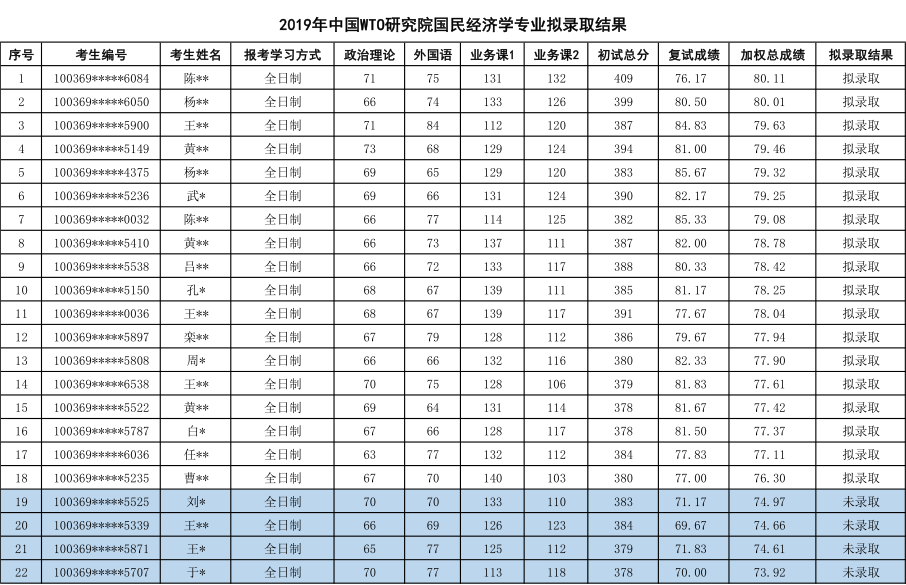 2019年对外经济贸易大学世界经济专业(WTO研究院)硕士研究生拟录取名单