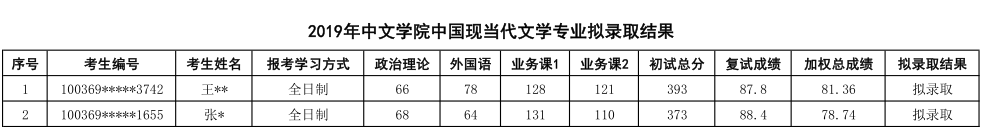 2019年对外经济贸易大学中国现当代文学专业硕士研究生拟录取名单
