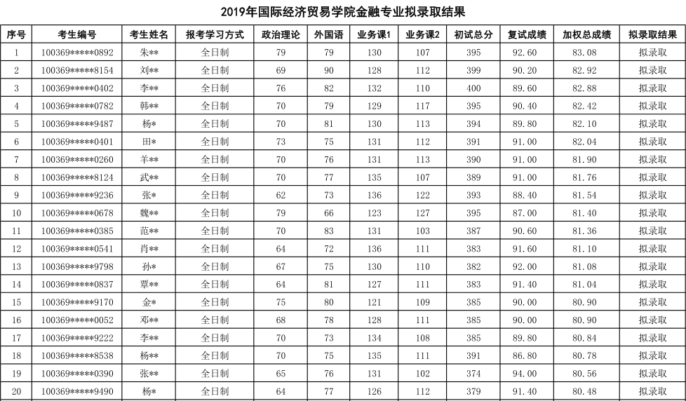 2019年对外经济贸易大学金融硕士(金融院)专业研究生拟录取名单