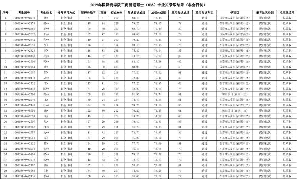 2019年对外经济贸易大学工商管理硕士(MBA全日制)专业研究生拟录取名单