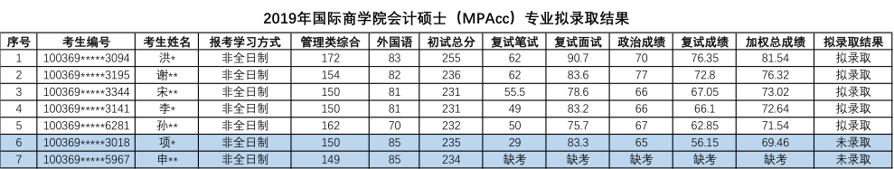 2019年对外经济贸易大学会计硕士(MPAcc全日制)专业研究生拟录取名单