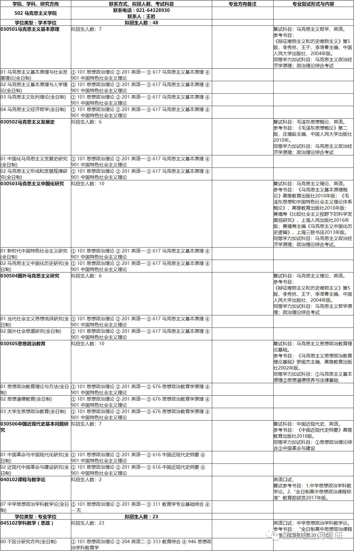2020年上海师范大学马克思主义学院招生专业目录