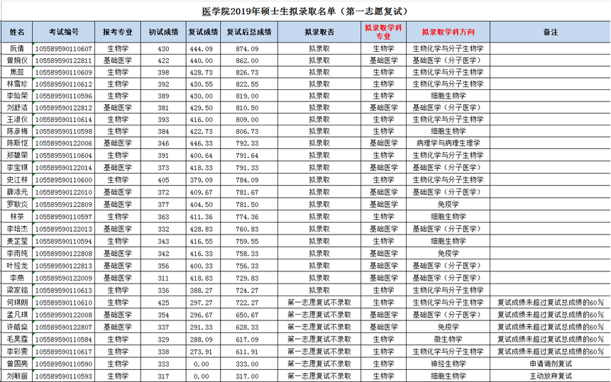 中山大学医学院2019年全国硕士生招生复试(第一志愿考生复试)拟录取结果公示