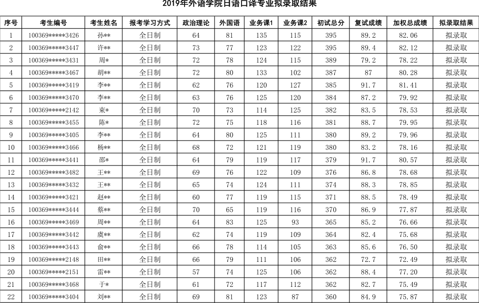 2019年对外经济贸易大学日语口译专业硕士研究生拟录取名单