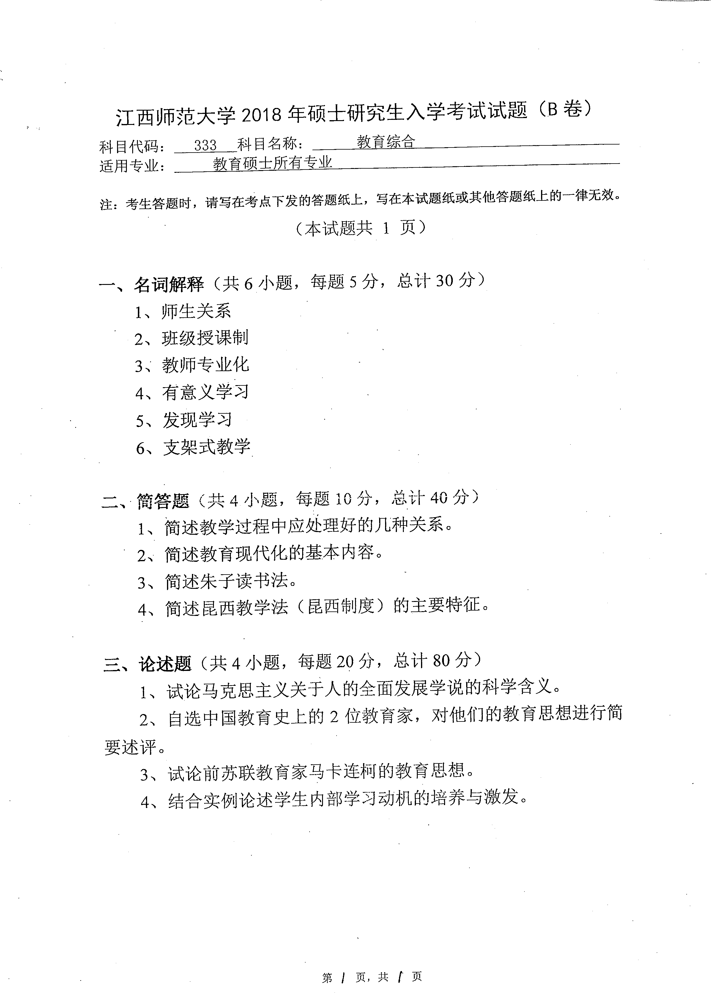 江西师范大学2018年333教育综合研究生入学考试真题
