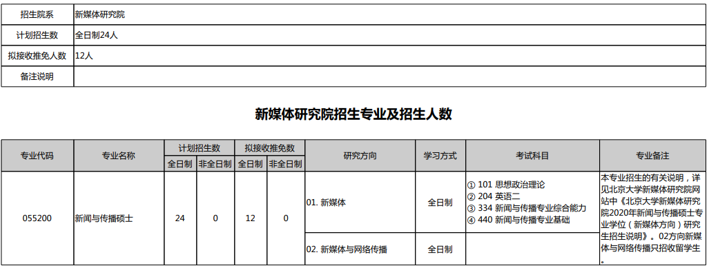 最新!2020年北京大学新媒体研究院(校本部)研究生招生专业目录公布!