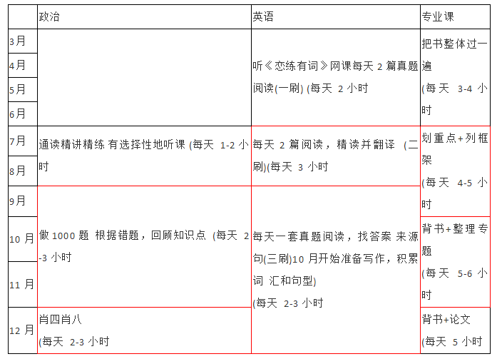 用红框标注的是我认为每个科目比较重要的阶段!前期没有必要从早学到晚,战线拉得 太长后期容易疲乏,7-11 月是比较关键的阶段,基本上每天的学习时间保持在 10-12 小时 左右,12 月可以调整好作息,保证上午下午都有充足的精力,为考场上的稳定发挥做准备。
