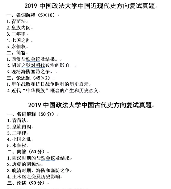 2019年中国政法大学中国古代史、近现代史方向考研复试真题