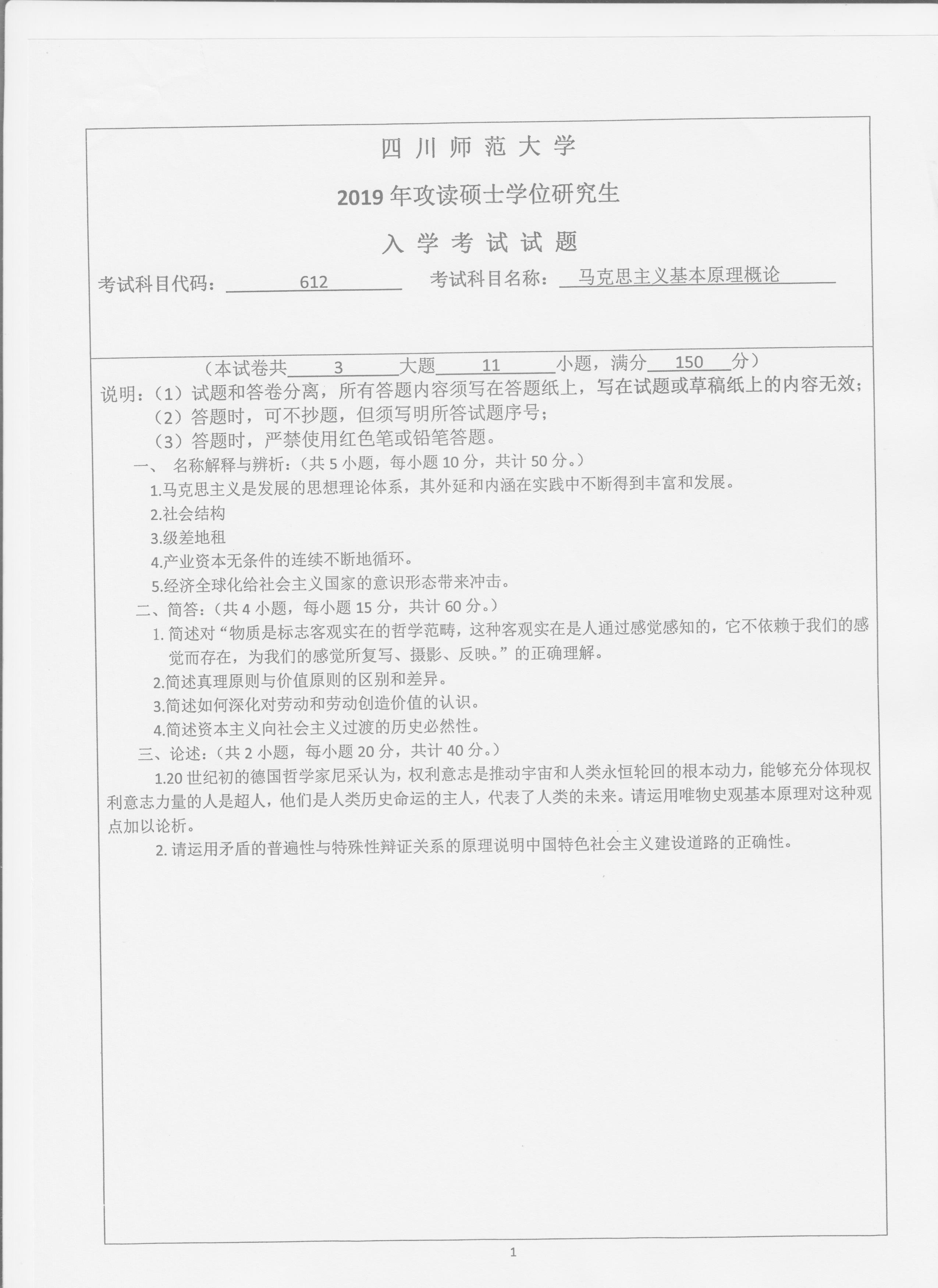 2019年四川师范大学马克思主义理论专业612考研真题完整版--新祥旭考研