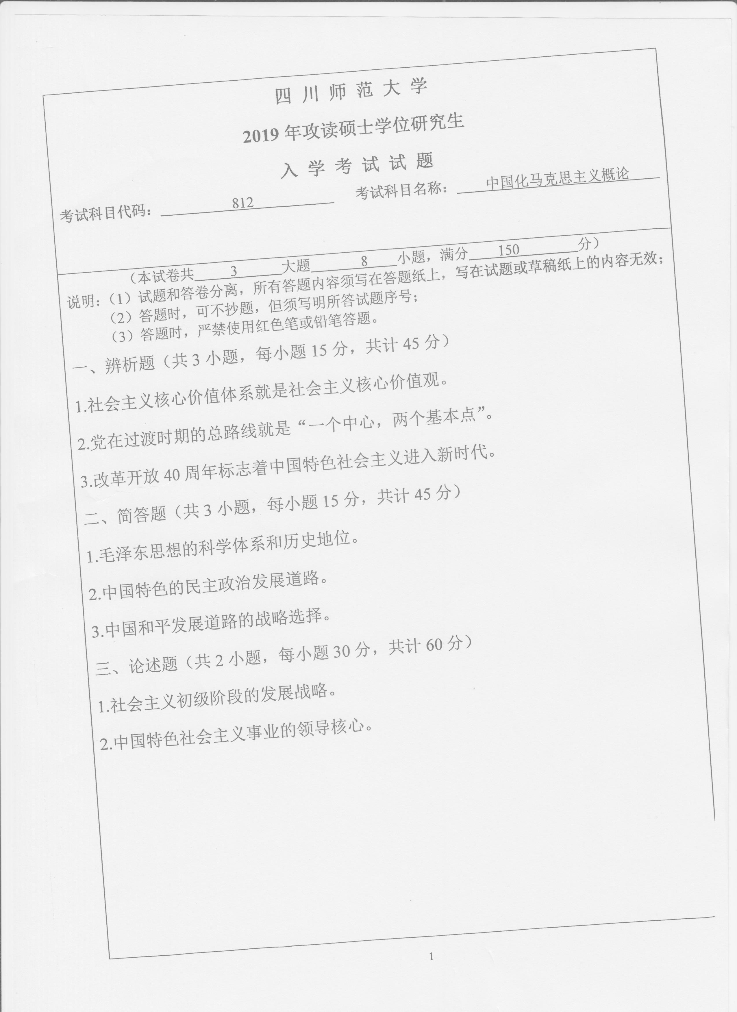 2019年四川师范大学马克思主义理论专业812考研真题完整版--新祥旭