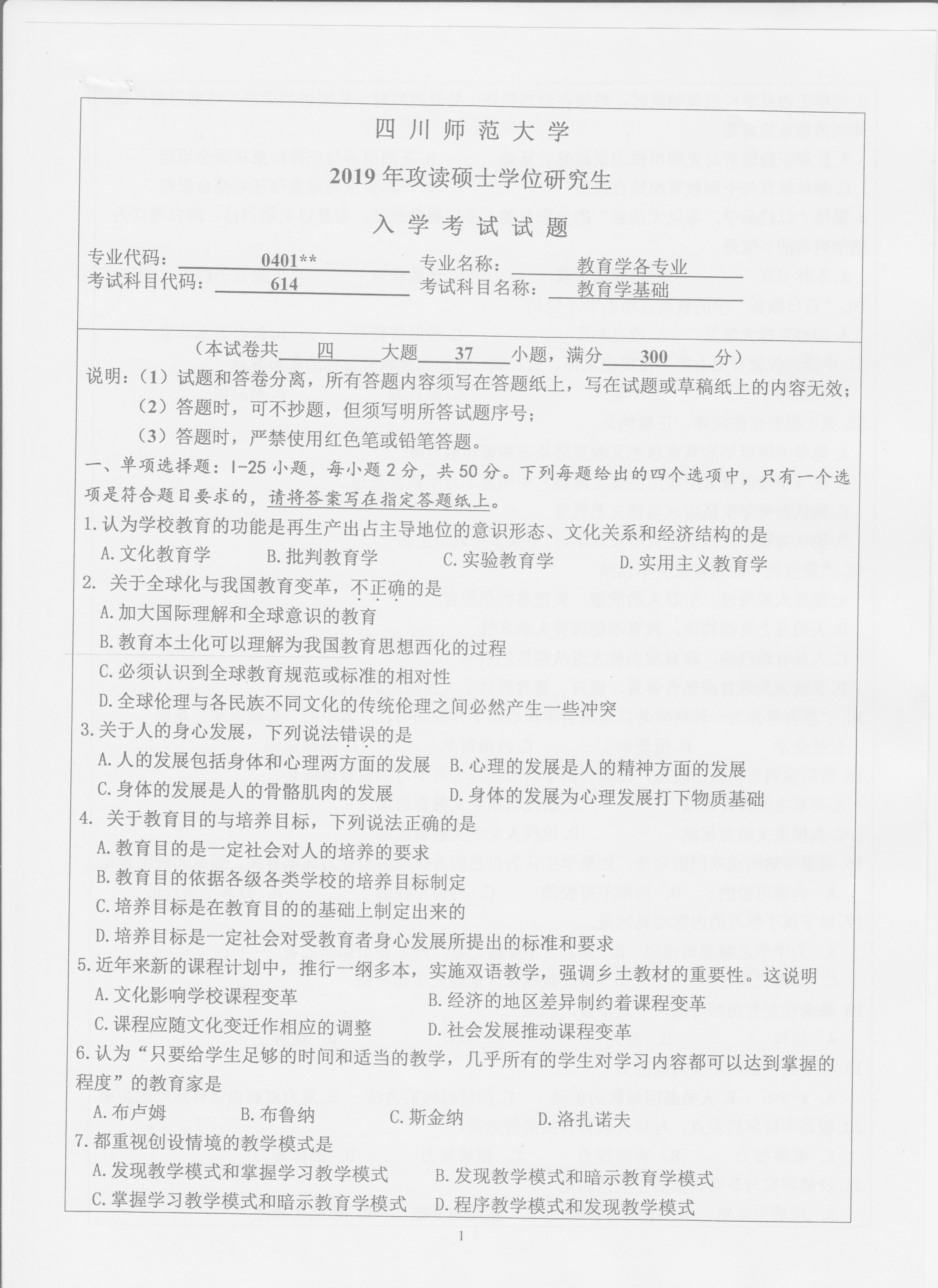 2019年四川师范大学614教育学基础考研真题完整版--新祥旭