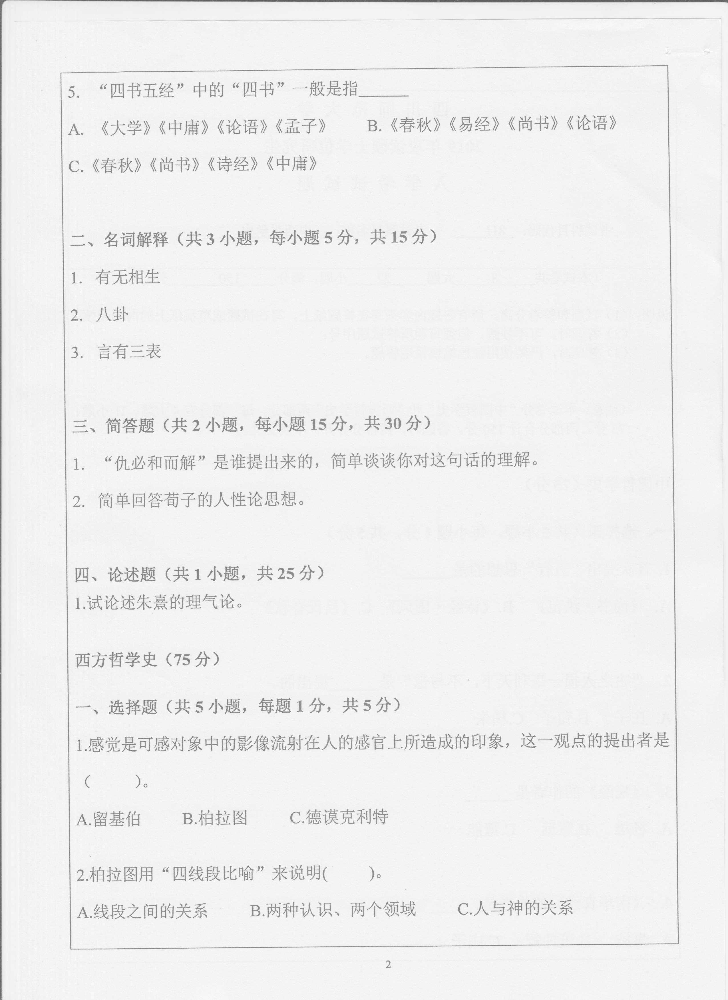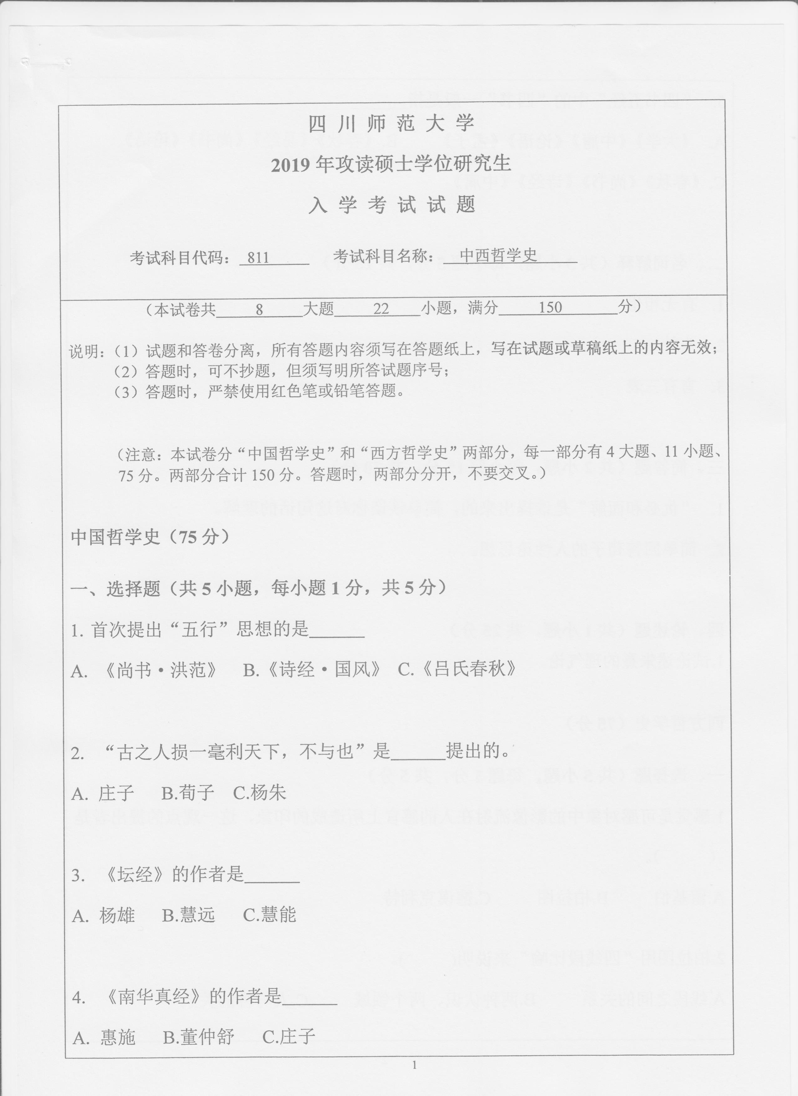 2019年四川师范大学811中西哲学史考研真题完整版--新祥旭