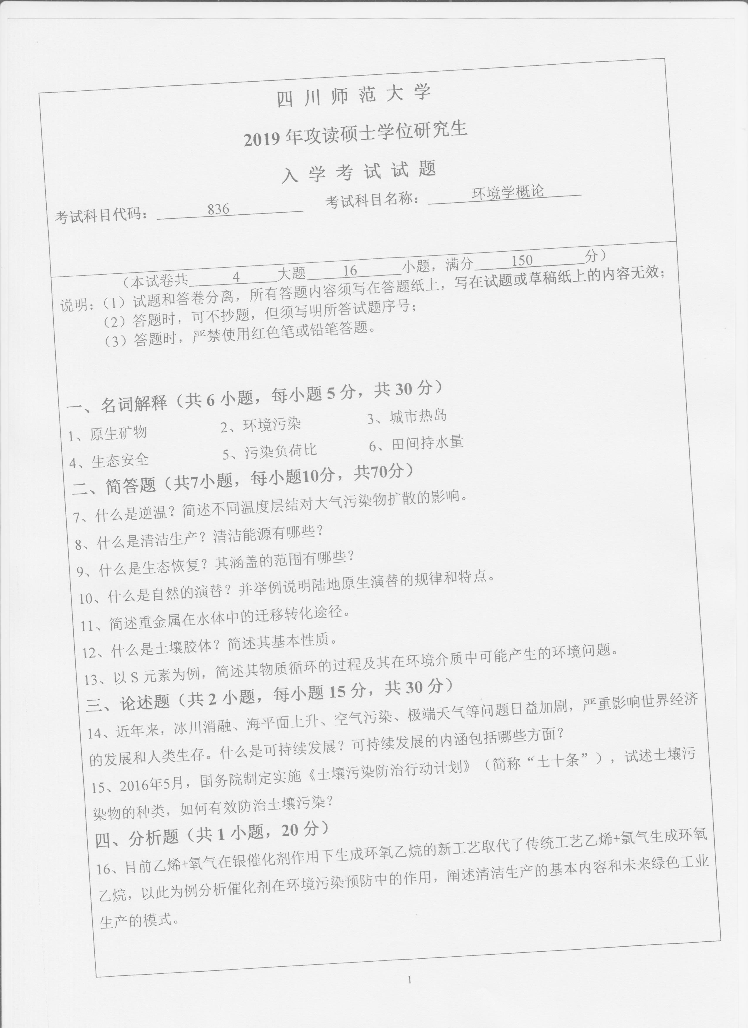 新祥旭考研--2019年四川师范大学836环境学概论考研真题完整版