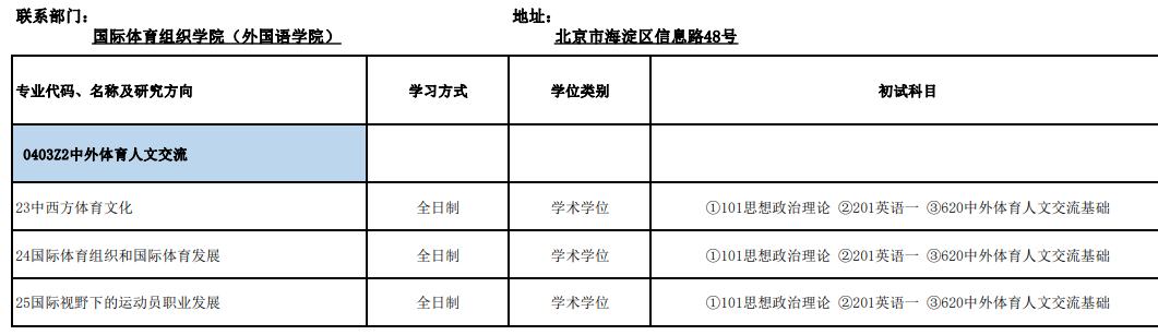 北京体育大学考研辅导班:北体国际体育组织学院(外国语学院)2020年考研招生目录
