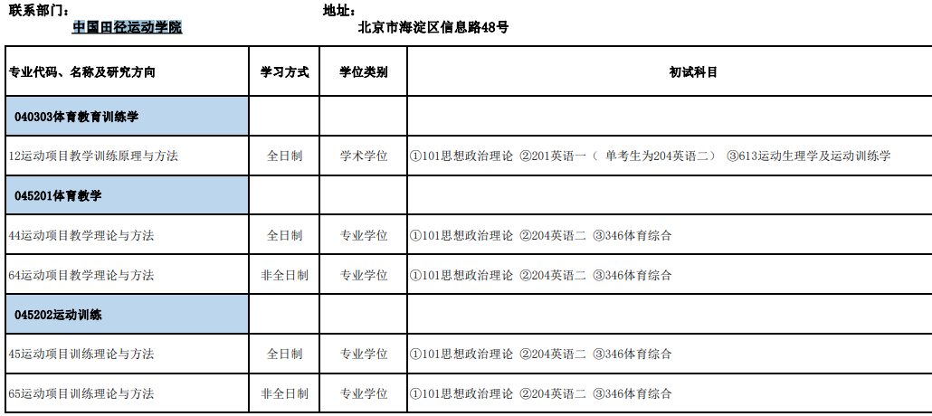 北京体育大学考研辅导班:北体中国田径运动学院2020年考研招生目录