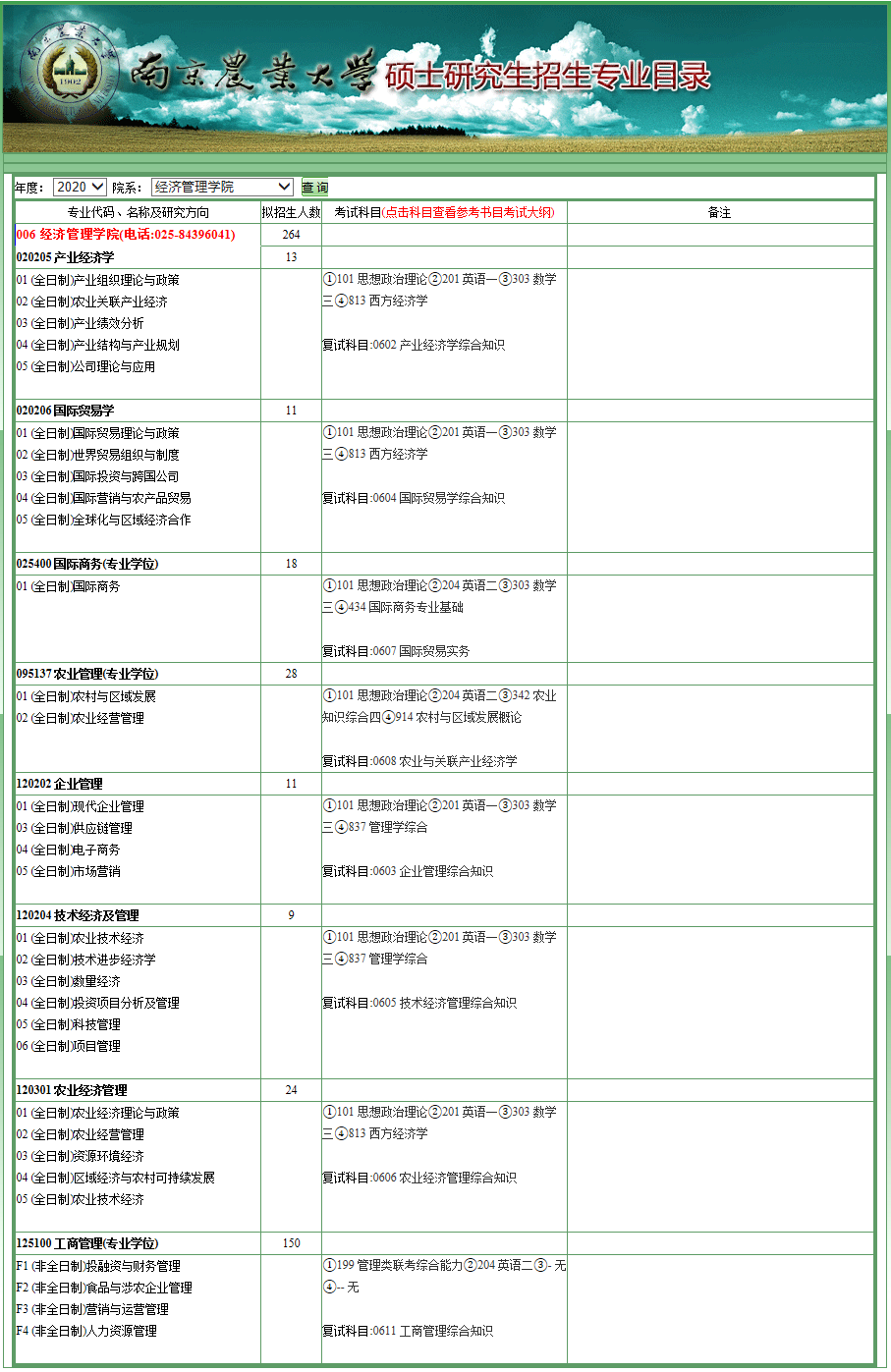 南农考研辅导班:2020年南京农业大学经济管理学院考研专业目录