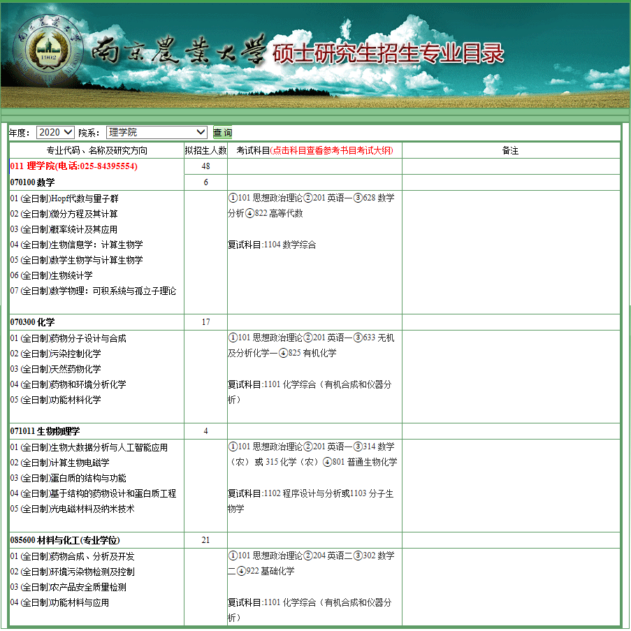 南农考研辅导班:2020年南京农业大学理学院考研专业目录