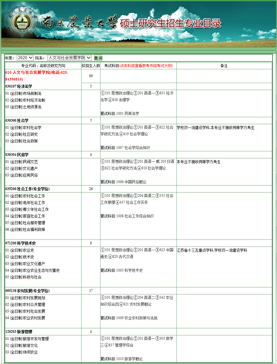 南农考研辅导班:2020年南京农业大学人文与社会发展学院考研专业目录
