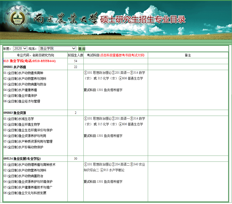南农考研辅导班:2020年南京农业大学渔业学院考研专业目录