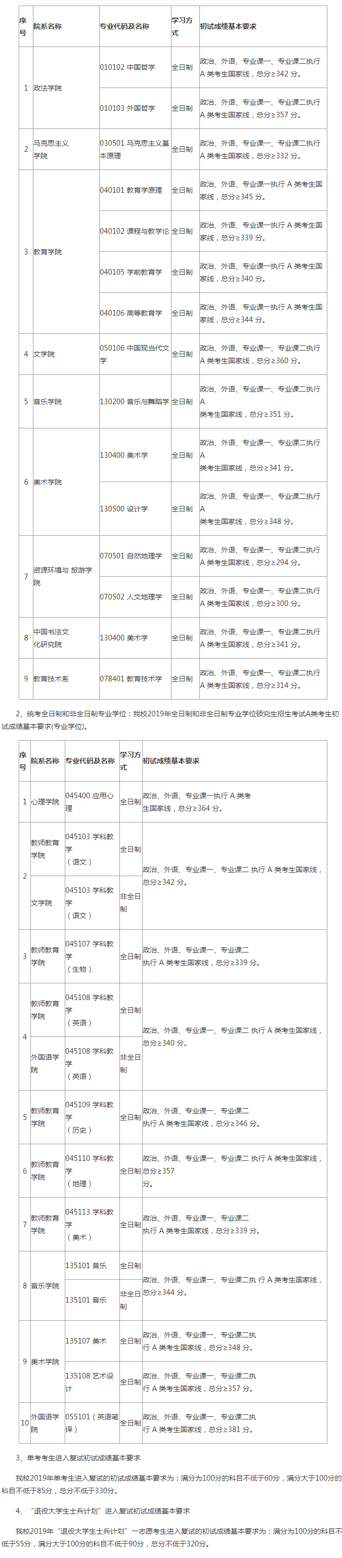 1、统考全日制学术型:我校2019年全日制学术型硕士生一志愿考生复试分数线除以下14个专业外,其他专业均执行2019年全国硕士研究生招生考试A类考生初试成绩基本要求(学术型)。