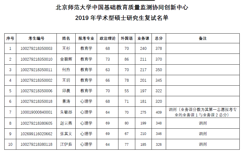 北师大考研辅导班:北师大协同中心2019年学术型硕士研究生复试名单