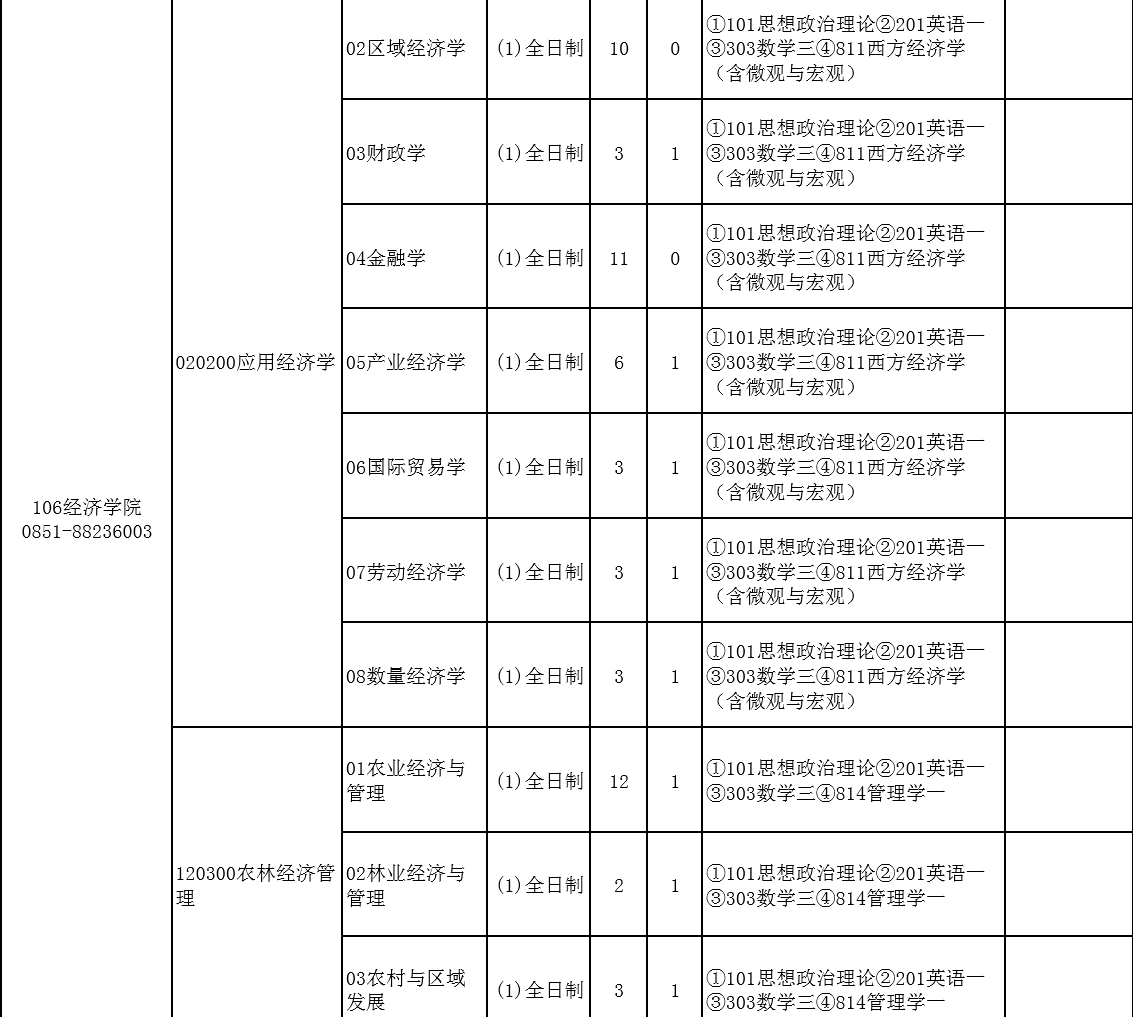 贵州大学考研辅导班:2020贵州大学经济学院研究生专业目录、招生人数、考试科目