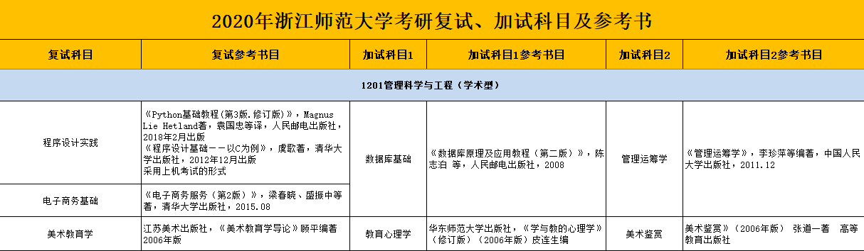 浙师大考研辅导班:2020年浙江师范大学复试参考书目-1201管理科学与工程(学术型)