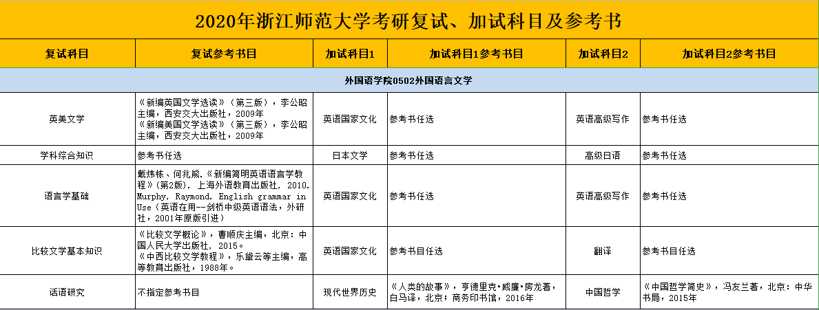 浙师大考研辅导班:2020年浙江师范大学复试参考书目-外国语学院0502外国语言文学