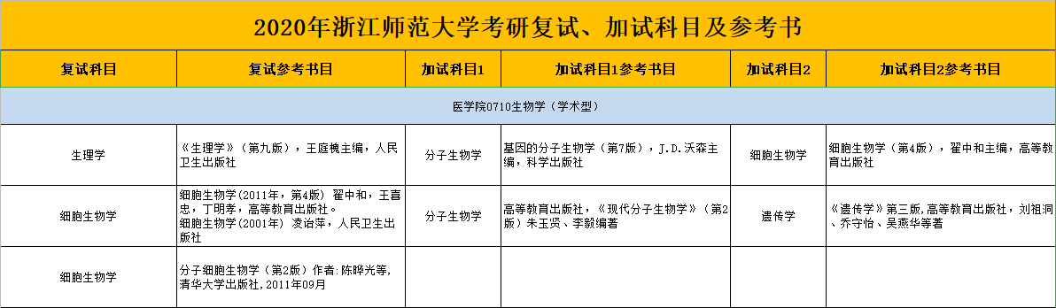浙师大考研辅导班:2020年浙江师范大学复试参考书目-医学院0710生物学(学术型)