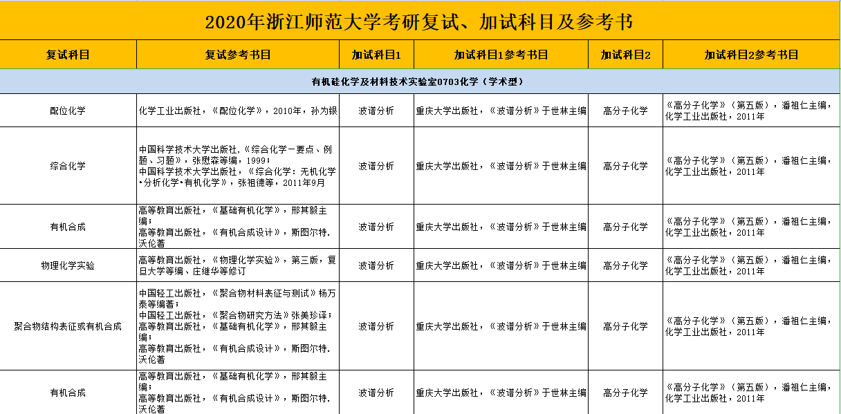 浙师大考研辅导班:2020年浙江师范大学复试参考书目-有机硅化学及材料技术实验室0856材料与化工(专业型)