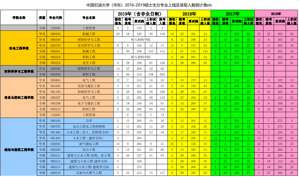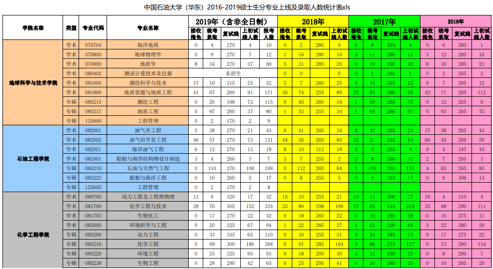 中国石油大学(华东)考研辅导班:2016-2019年中国石油大学(华东)硕士分专业上线及录取人数统计表
