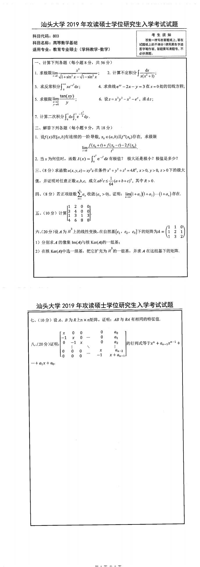 汕头大学考研辅导班:2019年汕头大学考研803高等数学基础真题