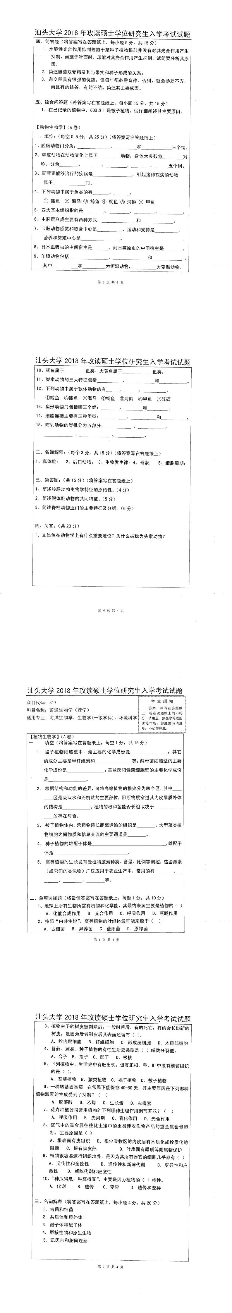 汕头大学考研辅导班:2018年汕头大学考研817普通生物学(理学)真题