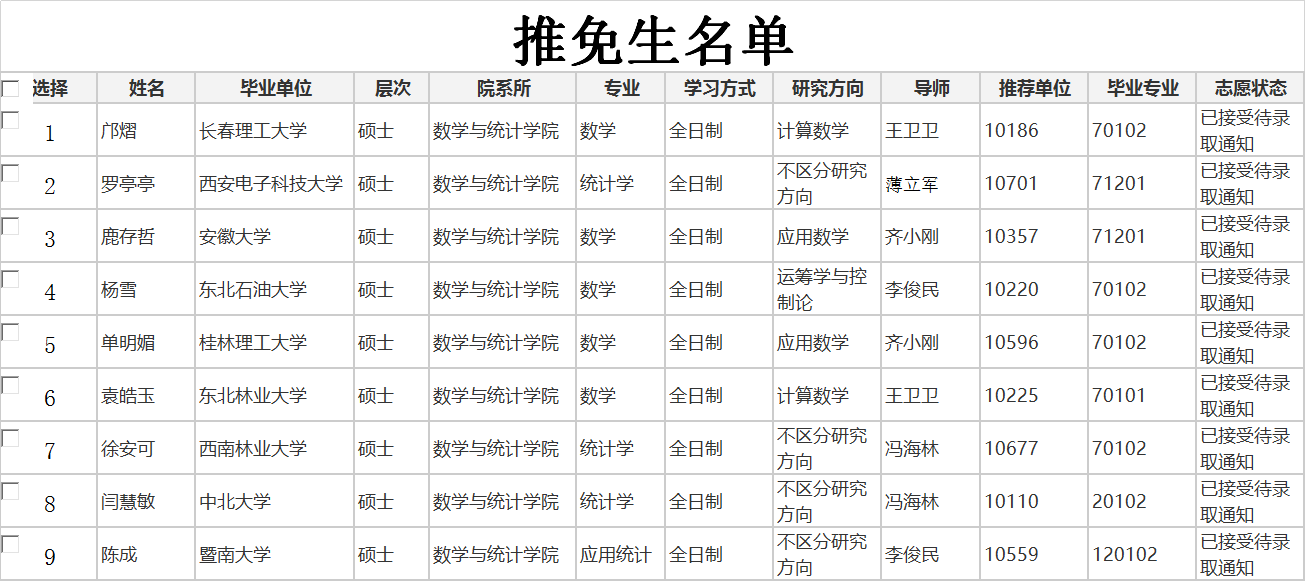西安电子科技大学考研辅导班:2020年西安电子科技大学数学与统计学院推免生名单