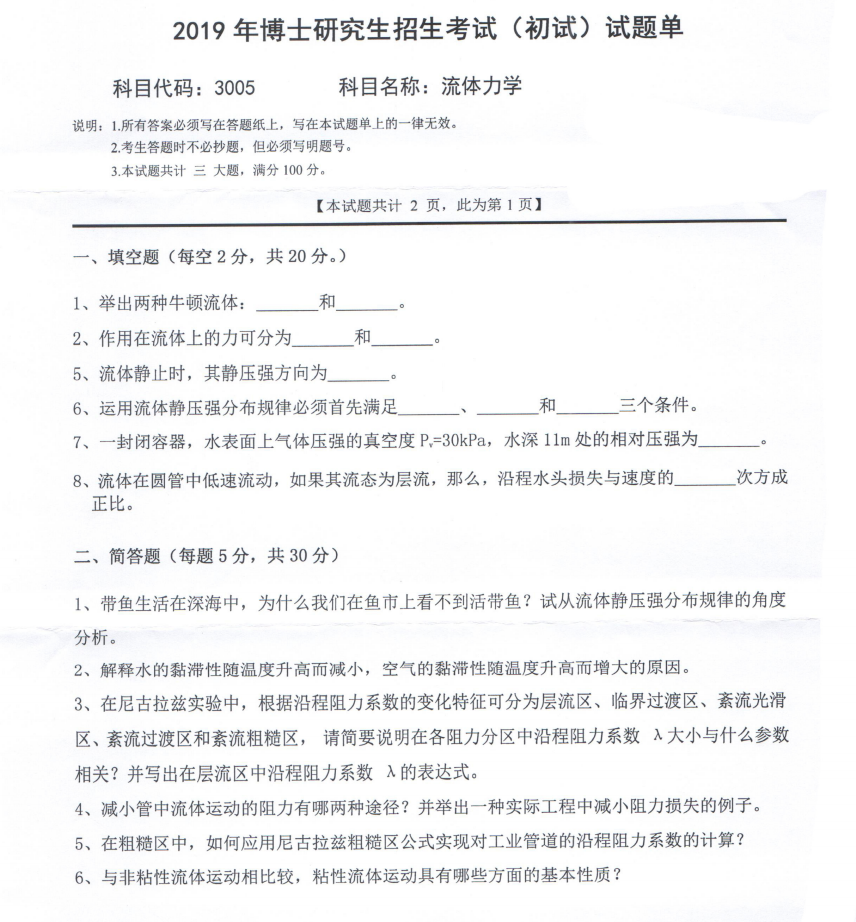 西南科技大学考博辅导班:2019年西南科技大学3005流体力学考博真题分享