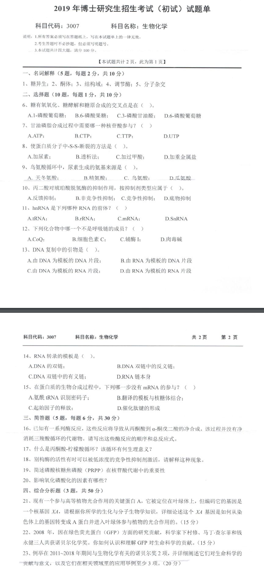 西南科技大学考博辅导班:2019年西南科技大学3007生物化学考博真题分享