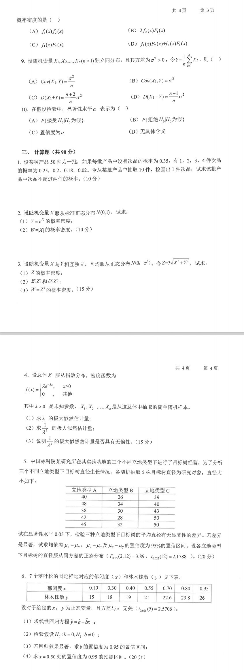 林科院考研辅导班:2019年中国林业科学研究院考研专业课701数理统计(含概率论)招生考试真题