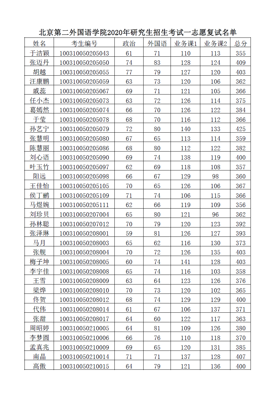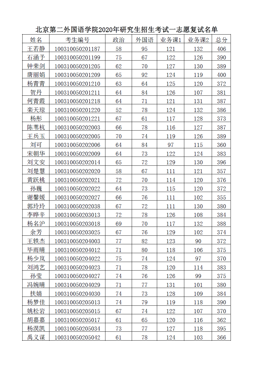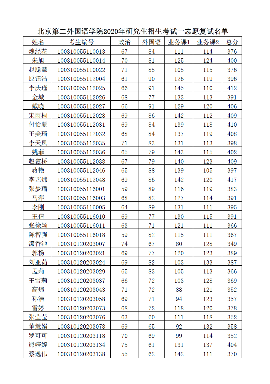 北京第二外国语学院考研辅导班:北京第二外国语学院2020年研究生招生考试一志愿复试名单