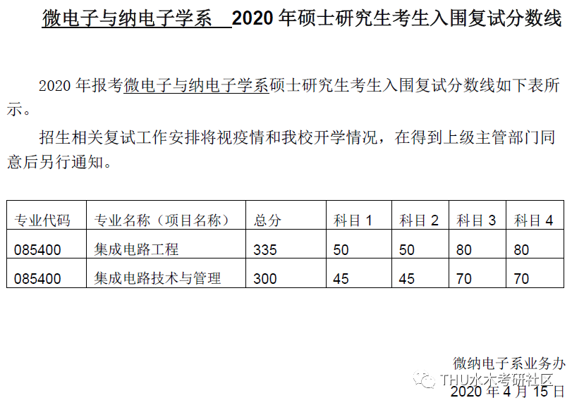 清华大学考研辅导班:清华大学微电子与纳电子学系2020硕士研究生考生入围复试分数线