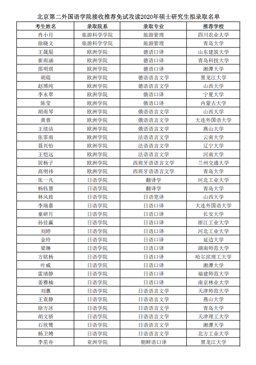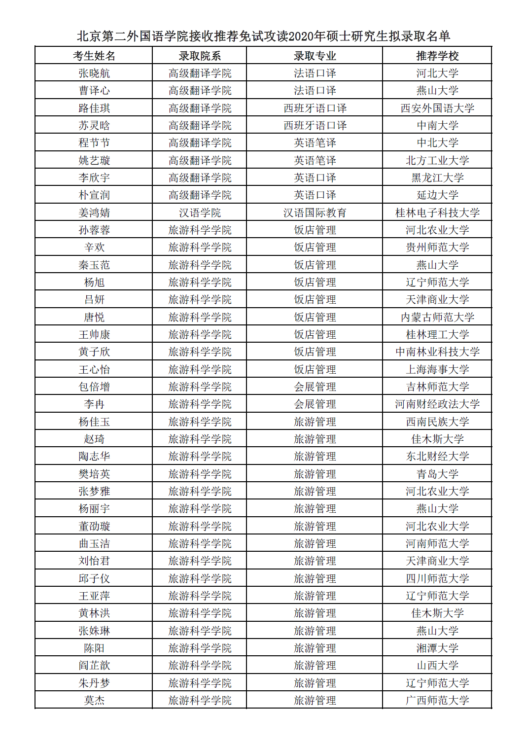 北京第二外国语学院考研辅导班:北京第二外国语学院接收推荐免试攻读2020年硕士研究生拟录取名单