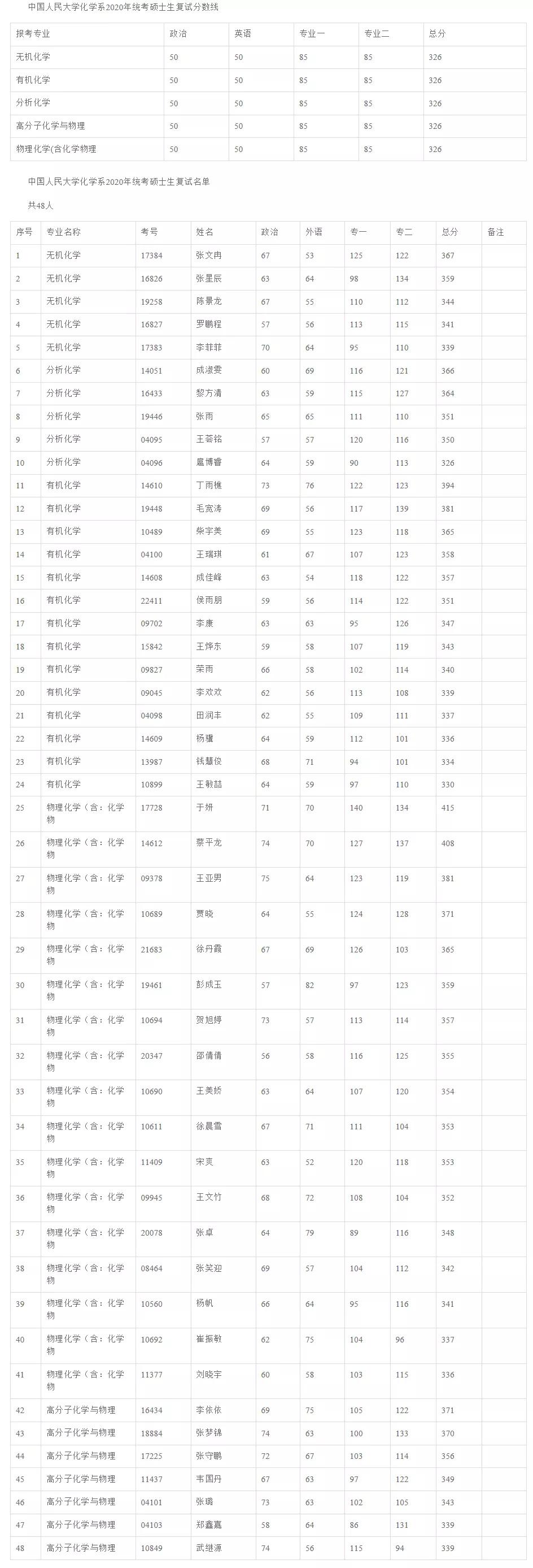 人大考研辅导班:中国人民大学化学系2020年考研复试分数线与复试名单