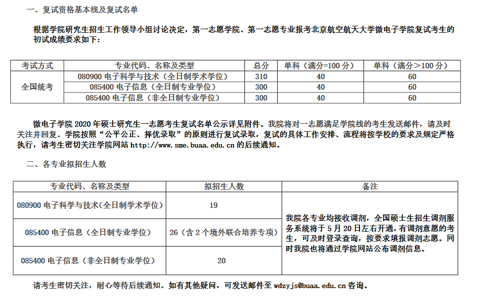 北航考研辅导班:2020年北京航空航天大学微电子学院考研复试分数线及拟招生人数