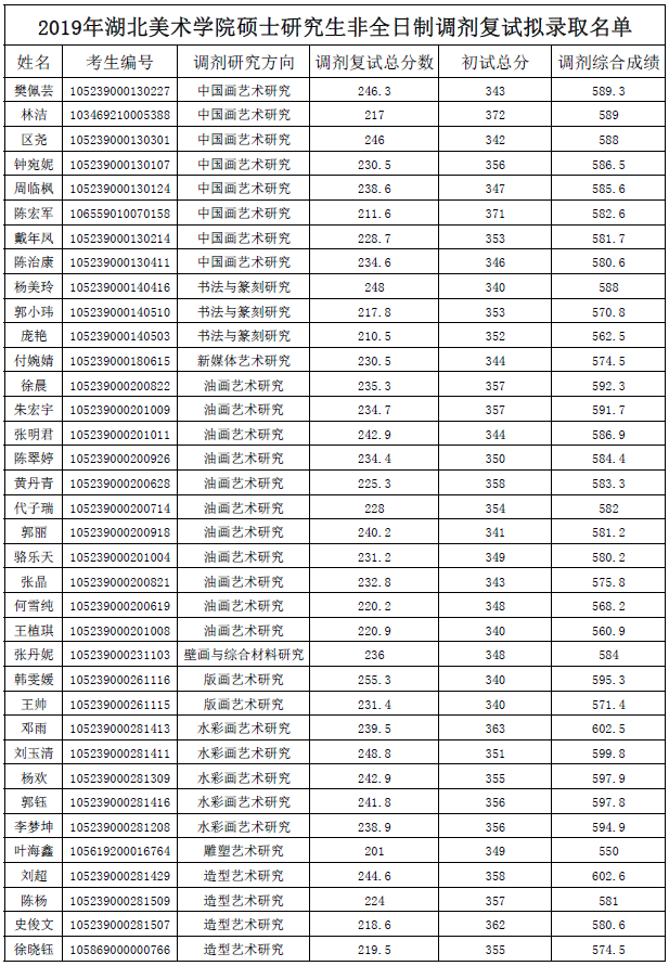 湖北美术学院考研辅导班:2019年湖北美术学院硕士研究生招生调剂复试拟录取名单公示