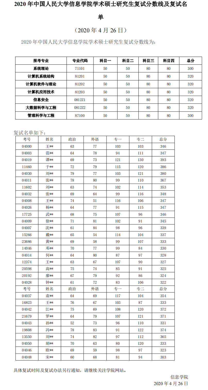 中国人民大学考研辅导班:中国人民大学2020年信息学院学术硕士研究生复试分数线及复试名